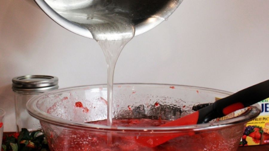 4Agrega la mezcla de la gelatina a la de fresas y revuelve hasta que el azúcar esté completamente disuelto y bien incorporado.
