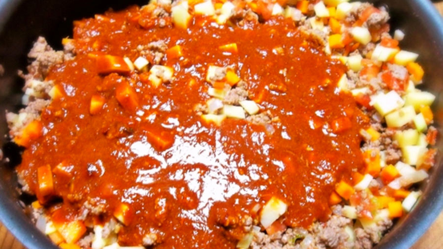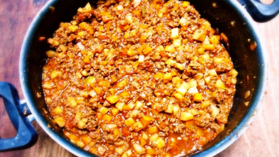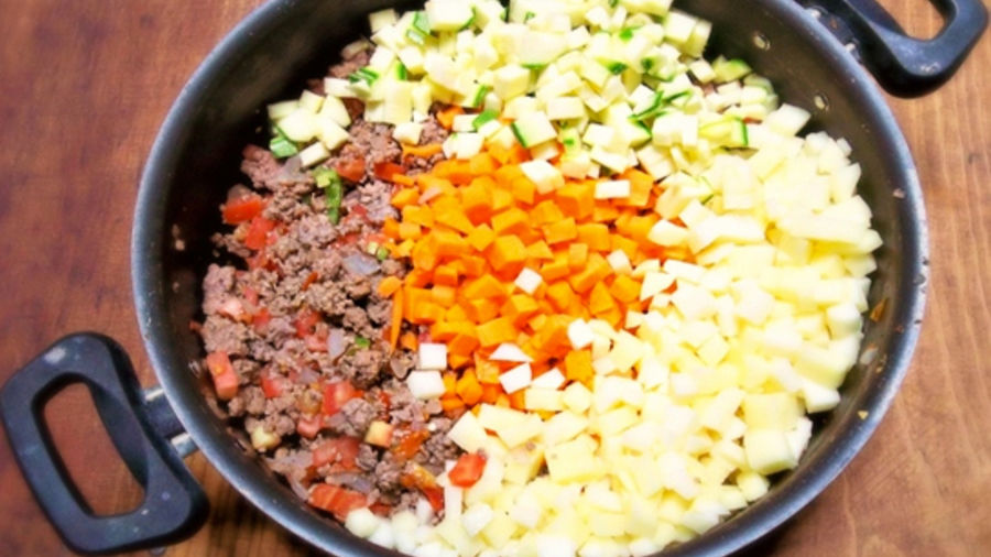 En una cacerola grande, pon a calentar el aceite vegetal a fuego medio-alto. Añade la cebolla y el ajo; cocina durante 30 segundos. Agrega la carne molida de res, los jitomates y los chiles serranos hasta que la carne este cocida; sazona con el comino molido y sal al gusto. Agrega las zanahorias, las papas y las calabacitas.