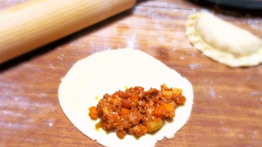 Pon 2 o 3 cucharadas de picadillo en el centro de cada círculo de masa. Humedece la orilla de la masa ligeramente con agua. Dobla la masa, cubriendo el picadillo y sella las orillas de la masa.