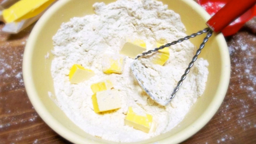Precalienta el horno a 350 grados F. En un tazón grande, mezcla la harina multiuso con la masa harina y la sal. Agrega la mantequilla, con ayuda de un machacador de papas, machaca hasta que los trozos de mantequilla queden tan pequeños como del tamaño de chícharos.