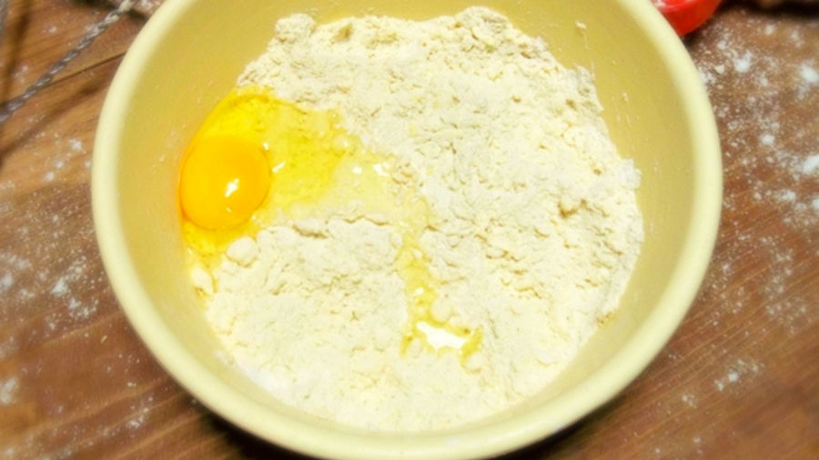 Añade el huevo hasta que se incorpore a la mezcla de harina. Agrega el agua fría, una cucharada a la vez, hasta que la masa forme una bola.