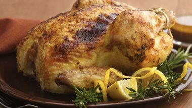 5In a small bowl, mix together the 2 teaspoons of lemon juice, honey, mustard, soy sauce and olive oil; rub onto the skin of the chicken.