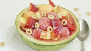 A los niños les encantará ayudar a decorar la corona terminada con “joyas” de bocadillos de frutas.