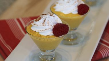 Arma la corona de merengue. Ayudándote con la base de papel, traslada la corona al plato donde deseas servir el postre (no retires el papel). Coloca la crema batida con parchita por encima del merengue, las rebanadas de mango formando una flor y decora con la salsa restante.