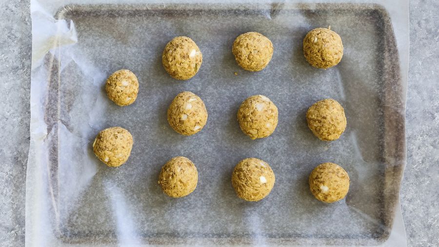 Divide la mezcla en 10 partes iguales. Con tus manos forma bolitas. Colócalas en una bandeja, o plato grande, y ponlas en el refrigerador por 30 minutos.