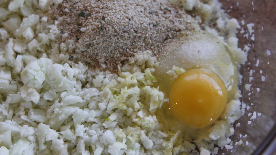 Mezcla la coliflor, los huevos, el ajo, la sal y el pan molido hasta integrar completamente.