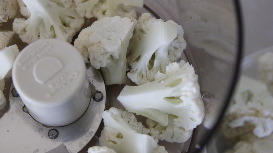 Coloca una capa de floretes en el procesador de alimentos y pulsa 18-20 veces hasta formar el “arroz.” Repite hasta que hayas terminado con toda la coliflor. No pongas todos los floretes al mismo tiempo porque no se picarán de manera uniforme. Normalmente toma unas 3 a 4 tandas.