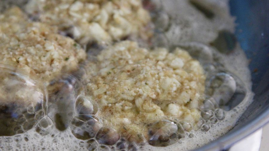 Forma una croqueta de 2 pulgadas de diámetro, la croqueta se sentirá un poco suelta, pero tomará forma al freír. Cuidadosamente deposítala en el aceite. Repite hasta que ocupes el espacio de la cacerola, dejando al menos una pulgada de distancia entre croquetas. Fríe por 2-3 minutos por lado o hasta que se doren. Saca del aceite y coloca sobre un plato cubierto con toallas de papel para absorber el aceite. Repite hasta freír todas las croquetas.