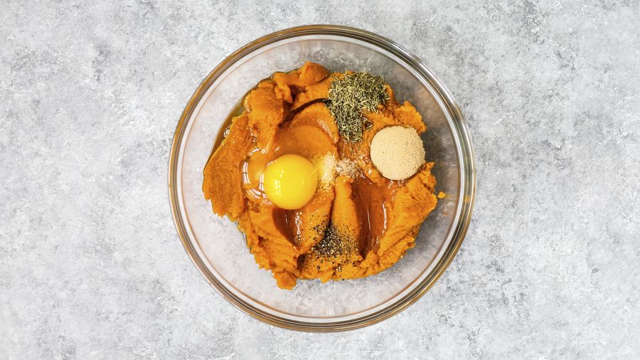 Coloca el puré de calabaza, azúcar morena, salvia, sal, pimienta, 1 taza de migas de pan y 1 huevo en un tazón mediano; mezcla hasta combinar. Refrigera la mezcla por 1 hora mínimo.