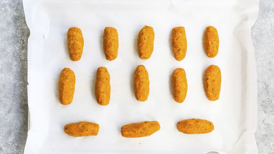 Divide la mezcla en 14 partes iguales. Con tus manos forma las croquetas en forma de cilindro. Colócalas en una bandeja, o plato grande, y refrigera en el refrigerador por 30 minutos.