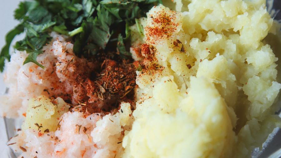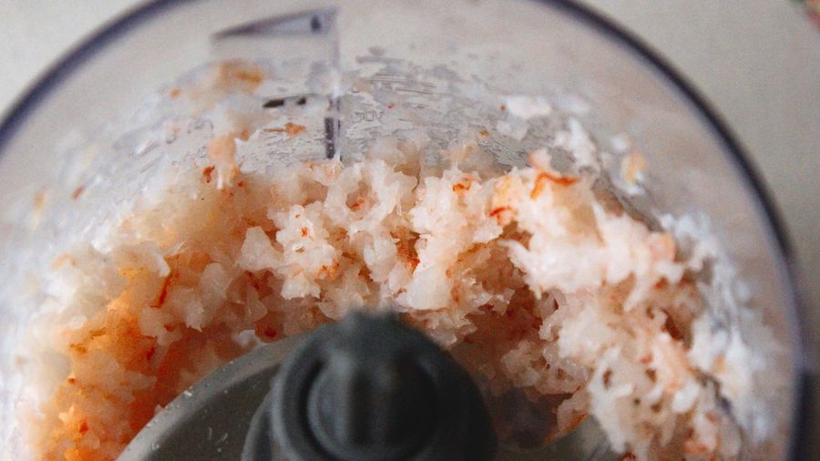 Vacía los camarones a un procesador de alimentos y tritúralos. Cuando el camote esté cocido, retira el agua y machácalo hasta hacerlo puré.