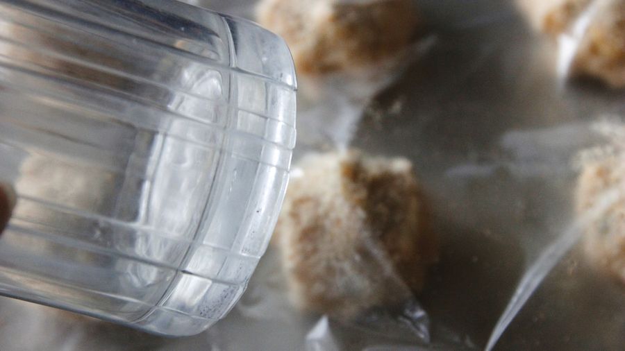 Saca las croquetas del congelador y con un vaso, sin remover el plástico que las cubre, apachurra cada croqueta levemente hasta formar un círculo ancho.