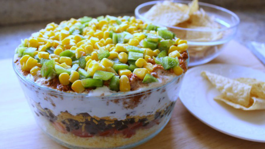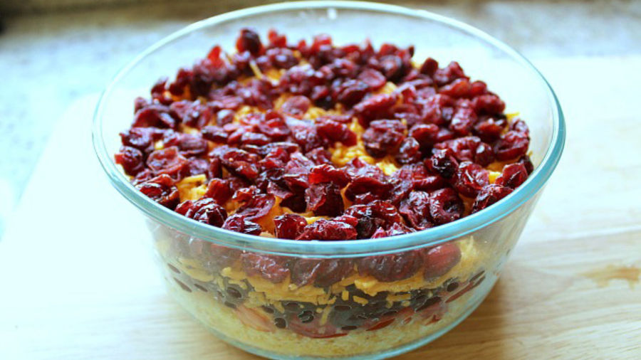 Continúa con una capa de tomates, una capa de frijoles, queso, crema agria, los arándanos, el pavo, el resto de la cebolla picada, y