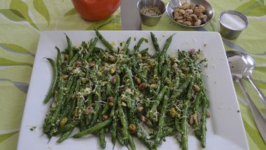 Puedes cocinar los ejotes hasta con dos días de anticipación, pero para obtener el color más brillante, no los revuelvas con el aderezo hasta antes de servirlos.