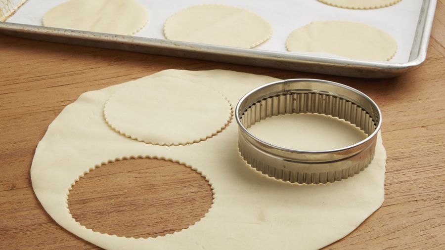 Saca la masa del paquete y desenróllala sobre una superficie grande y limpia. Con un molde de cortar galletas o el borde de un vaso, corta 16 discos de la masa.