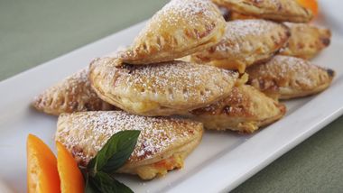 3Saca los discos de masa hechos para pie de las bolsas; despliégalas en la superficie de trabajo. Corta en 16 círculos (4 pulgadas cada uno). Moja los bordes con la mezcla de huevo. Coloca 2 cucharadas de relleno en cada disco un poco descentradas. Pliega la masa sobre el relleno; sella los bordes con un tenedor o el diseño que prefieras. Coloca las empanadas en una bandeja o charola para galletas sin engrasar. Recubre las empanadas con la mezcla de huevo, si lo deseas, esparce semillas de ajonjolí.