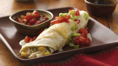 En una sartén antiadherente de 10 pulgadas, cocina el pollo, los chiles y la cebolla a fuego medio unos 3 minutos o hasta que el pollo esté caliente y la cebolla empiece a volverse translúcida. Retira del fuego; agrega el yogurt, el 1/4 taza de cilantro y el jugo de lima. Incorpora 1/2 taza de salsa para enchilada.