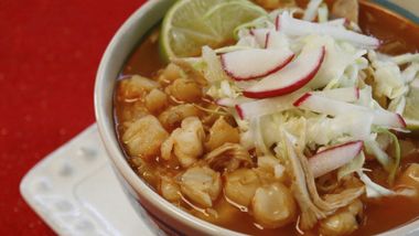 Agrega la cebolla. Vierte el caldo de pollo y lleva a punto de ebullición. Cuando esté hirviendo, reduce el fuego, cubre y cocina a fuego lento por 3 horas.