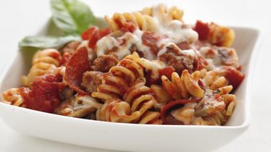 • Complace a una multitud con esta colorida mezcla de pasta, verduras y salami, con aderezo de queso parmesano.
