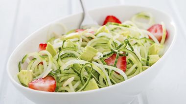 Muchas veces buscamos saciar el hambre y no encontramos alternativas para calmar los antojos sin sentir culpa después. Esta receta de ensalada de jícama, fresas y aguacate es ideal para esos momentos. Te permite comer algo delicioso y sin ningún cargo de conciencia. Disfruta una mezcla de frescas tiras de jícama, trocitos de queso, aguacate, fresas y un exquisito aderezo. ¡Como para repetirla una y otra vez!
