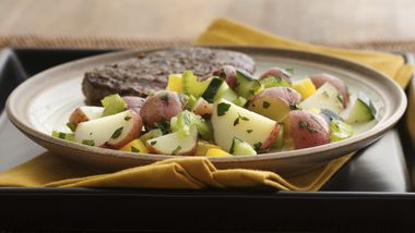 Agrega esta salsa a las papas con el resto del los ingredientes y usando una cuchara revuelve bien. Esta ensalada se puede comer como guarnición o como plato principal.