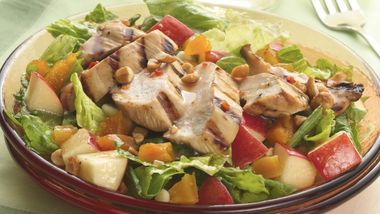 Corta los espárragos en piezas de 1 pulgada. En un tazón grande, mezcla los espárragos, las verduras verdes para ensalada, los tomates (jitomates) y la cebolla. Vierte el aderezo sobre la ensalada; revuelve para cubrir. Corta el pollo en tiras; sírvelo sobre la ensalada.