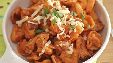 Éstas son tres formas fáciles para reducir la grasa en esta receta. Busca tortellini rellenos de queso con poca grasa. Utiliza tocino de pavo con poca grasa, en lugar del tocino de puerco o sólo reduce a la mitad la cantidad de tocino (6 o 7 rebanadas). Reduce las semillas de girasol a 2 cucharadas u omítelas.