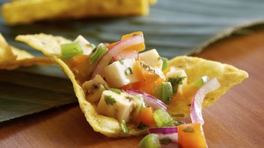 Otra forma de que luzca más como ceviche es hervir camotes y servirlos en rodajas al lado de la ensalada.