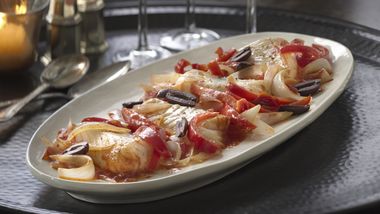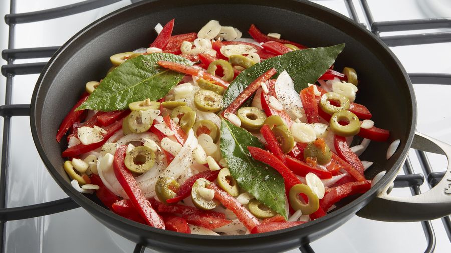Agrega la cebolla, ajo, pimiento morrón, hojas de laurel, aceitunas y pimienta.
