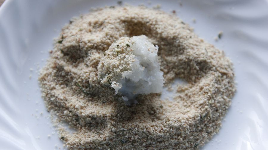 Vacía el resto del pan molido a un plato extendido. Toma una de las albóndigas y cuidadosamente cúbrela con el pan, repite hasta terminar con todas las albóndigas.