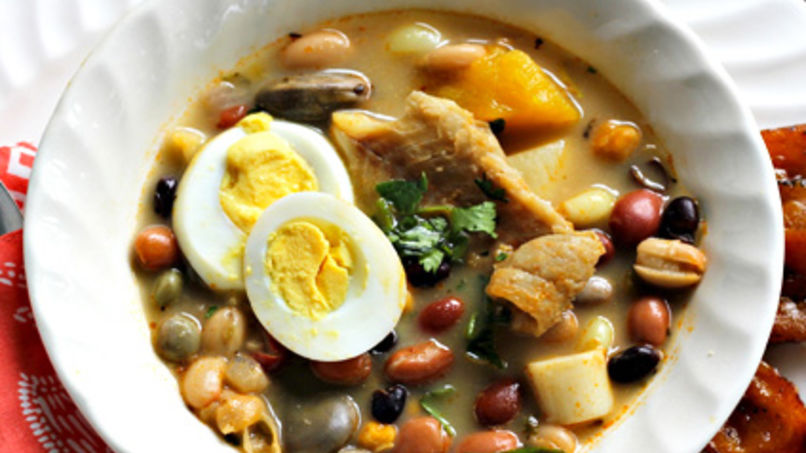 Enjuaga bien todos los frijoles para deshacerse del líquido en el que vinieron. Añádelos al refrito junto con los gandules, habas y choclos (maíz). Cúbrelos con 8 tazas de agua (añade más agua de ser necesario para cubrirlos por completo) y agrega el cubito de caldo de camarón y el cilantro. Separa unos puñados de cilantro picado para decorar si deseas.