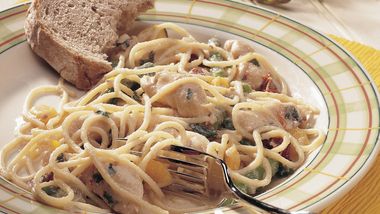 En un bol pequeño, incorpora gradualmente el caldo al almidón de maíz. Agrega revolviendo las cebollas y la albahaca. Incorpora la mezcla de almidón de maíz a la mezcla de pollo. Cocina y revuelve de 1 a 2 minutos o hasta que la preparación se haya espesado y esté burbujeante. Condimenta con sal. Mezcla con los fideos. Espolvorea con queso.
