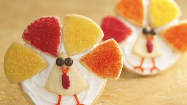 Revuelve el glaseado con 2 o 3 gotas de colorante para alimentos hasta que se haya mezclado bien. Cubre y decora de a 1 galleta por vez. Luego de extender el glaseado sobre la galleta, agrega las mitades de las chispas de chocolate para formar los ojos, el regaliz cubierto de caramelo amarillo para formar las plumas y las rebanadas de dulces anaranjados para formar el pico y las patas.