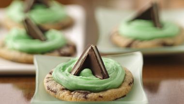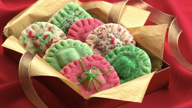 En un bol pequeño, mezcla el glaseado y el extracto de menta. Esparce el glaseado en cada galleta. Con una cuchara pequeña, espolvorea el azúcar roja en las galletas haciendo un diseño de espiral para simular los caramelos de menta.