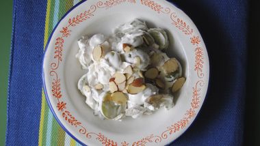 ¿No te apetece una ensalada? No hay problema. Puedes hacer un gazpacho para beber las verduras y de esta manera hacer que tus hábitos de alimentación sana sean frescos y novedosos. Esta sopa fría de verano está llena de sabor y bondades, una combinación que es cada vez más difícil de encontrar en nuestra dieta moderna. Originario de la región sur de Andalucía, en España, este famoso plato se prepara en todo el mundo y de muchas formas diferentes. Éste, por ejemplo, tiene uvas y almendras como sus ingredientes principales. Goza de un sabor muy suave y ligeramente dulce. Otras versiones del gazpacho incluyen aguacate, sandía, o el original con tomates frescos.