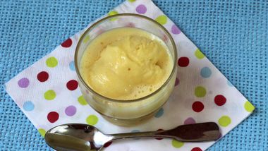 Añade aproximadamente una cucharada de la mezcla caliente a la mezcla de yemas de huevo. Luego poco a poco coloca la mezcla de yemas de huevo en la mezcla caliente.