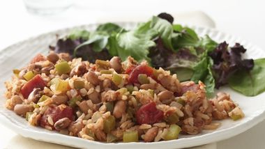 Place vegetable packet on grill over medium heat. Cover grill; cook 6 minutes, turning once. Meanwhile, in large bowl, mix onions, vinegar, salt, thyme and pepper sauce; set aside. Cook rice in water as directed on package.
