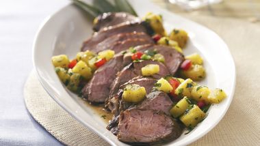 Remove toothpicks from pork. Cut pork across grain into thin slices. Serve with pineapple.