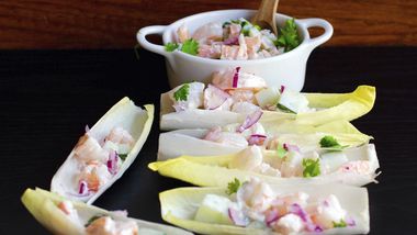Coloca una capa de lechuga y cebolla sobre la mitad de cada pan. Luego los camarones cocidos y agrega la salsa de yogurt griega a tu gusto. Dobla y sirve inmediatamente.