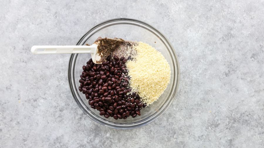 Coloca la mezcla en un tazón grande, agrega la lata restante de frijoles negros y las migas de pan. Mezcla hasta que estén bien combinados.