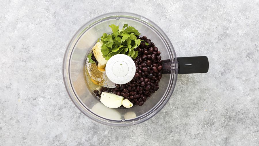 En un procesador de alimentos, coloca 1 lata de frijoles negros, cebolla, ajo, cilantro, huevo, sal y pimienta. Procesa hasta que se tenga textura de puré.