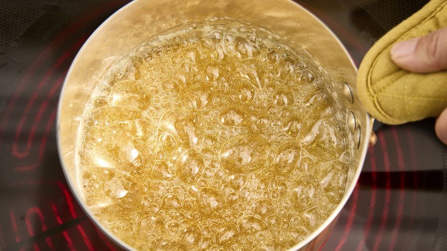 2Place 3/4 cup sugar and 1/4 cup water in a medium saucepan over medium-high heat. Swirl the pan every few minutes, but do not stir. Heat until sugar melts evenly. Cook the caramel until it turns golden-brown. The caramel will continue to cook even when taken off the heat so be sure to remove from heat before it reaches the desired color.![]()