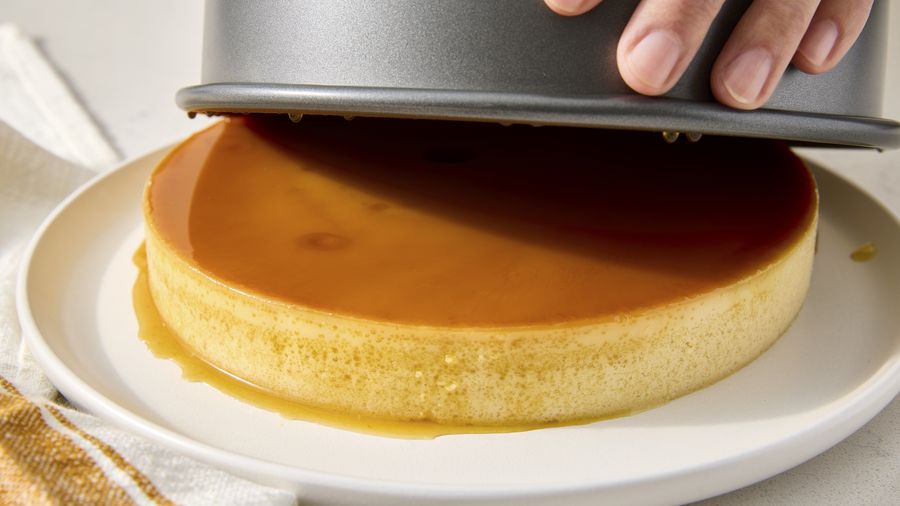 8Run a small metal spatula or knife around the edge of the cooled flan to loosen it from the pan. Place rimmed serving plate upside down over pan. Flip over and tap gently until you feel the flan release. Reserve extra caramel left in the pan for serving. Refrigerate until ready to serve. To serve, drizzle with reserved caramel. Store in the refrigerator.![]()
