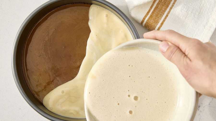 3Pour caramel into a 8-inch round non-stick cake pan. Carefully spread caramel inside the baking pan until it covers the sides. Let cool.
