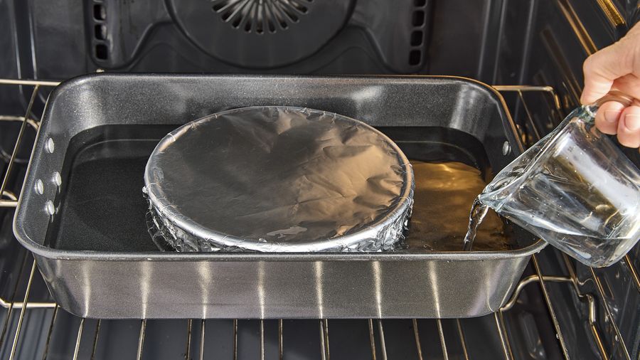 7Carefully remove roasting pan from the oven. Remove cake pan from the water bath and place on a wire rack. Cool completely.