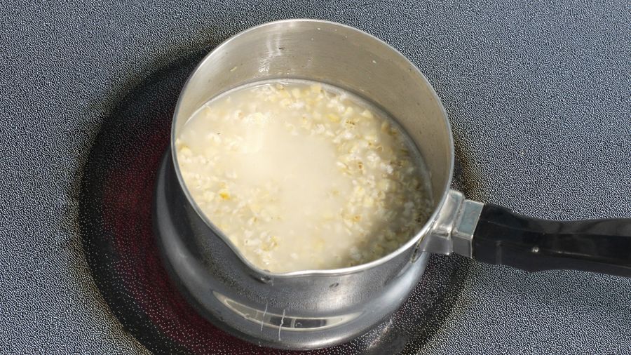 En una cacerola pequeña, prepara la avena con agua y sal. Revuelve y baja el fuego, cocina por 5 minutos.