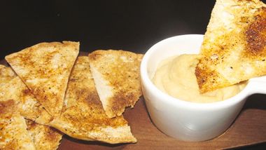 Sirve el humus de cilantro en un tazón y adereza con aceite de oliva. Acompaña con tostaditas o con pan árabe.