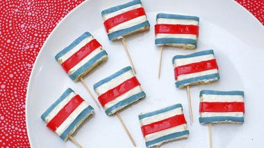 Corta una galleta con la forma de un tambor y agrega los adornos correspondientes con Fruit by the Foot® rojo y amarillo (de la misma manera que con el cuatro).