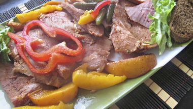 Retira el jamón del horno. Cúbrelo holgadamente con aluminio; deja que repose 10 minutos. Justo antes de servir, calienta la mezcla de frambuesas restante. Sirve el jamón con la salsa de frambuesas caliente.