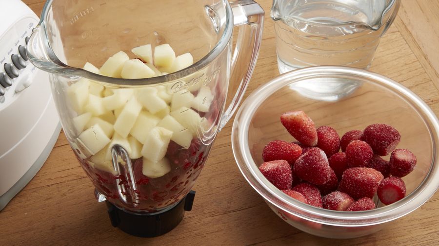 Coloca todos los ingredientes, incluida la mitad del agua, dentro de una licuadora y licua hasta obtener un batido espeso.